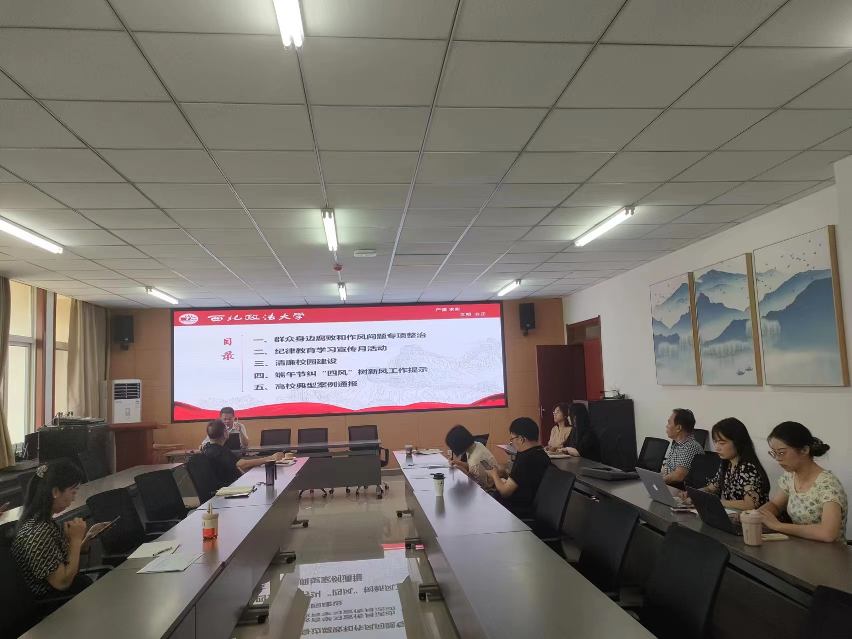 会议传达了6月21日上午学校警示教育会议精神和校党委副书记、纪委书记、监察专员肖道远讲话要求。对学院上半年开展的群众身边腐败和作风问题整治、纪律教育学习宣传月活动、清廉校园建设等工作进行了总结,并通报了目前存在的问题。强调全院上下要以底线思维守护安全稳定大局,严格落实意识形态工作责任制,坚决扛起从严治党的主体责任,把严的要求渗透到思想、作风、制度建设各方面,融入办学育人治院全过程,确保从严管党治院无死角、全覆盖。要求认真学习制度文件,对标对表任务清单,高质量完成年度各项任务。