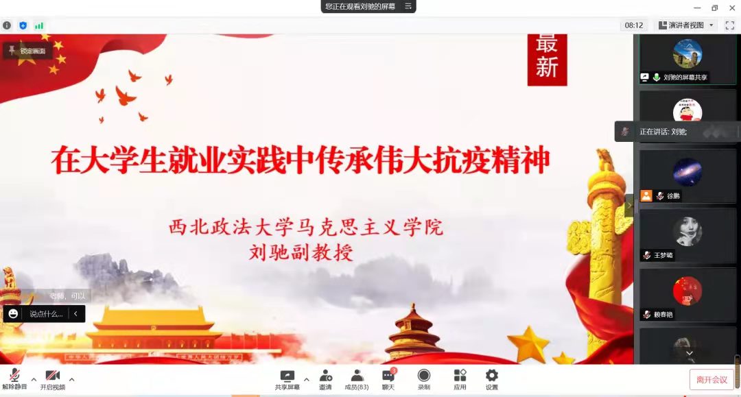 党委书记刘驰在线上讲授了“在大学生就业实践中传承伟大抗疫精神”的开学“第一课”。学院学生党支部书记徐鹏、辅导员刘栩源以及全体研究生参加讲座。