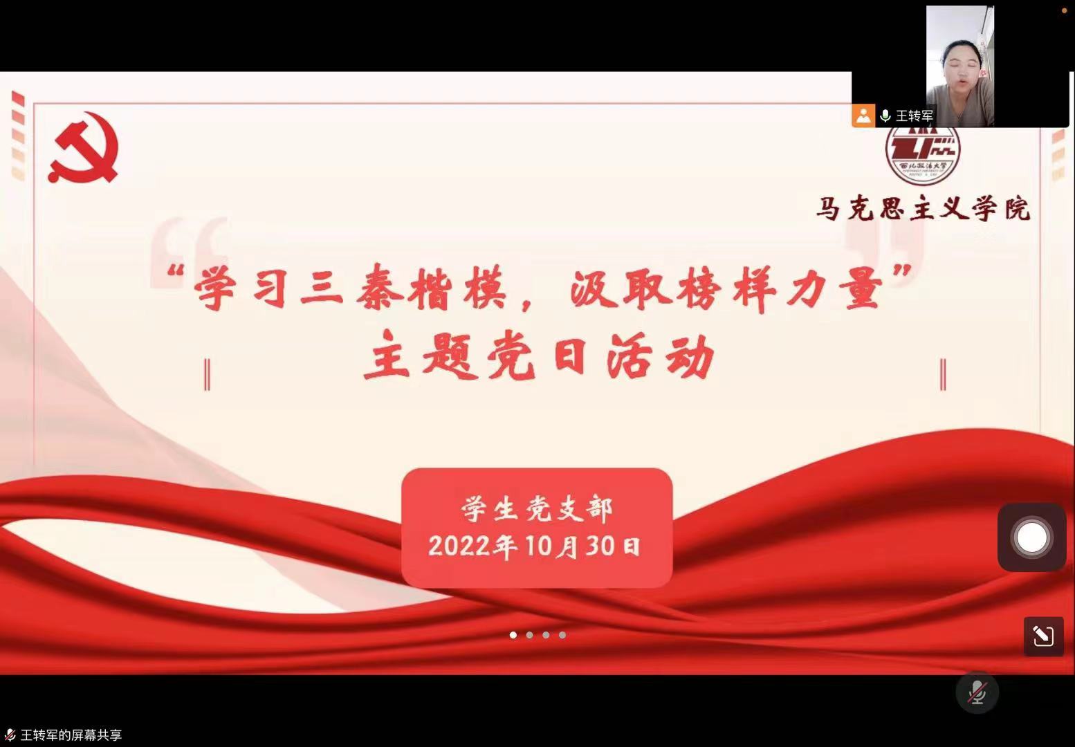 最后,党支部副书记王转军同志作总结发言。她指出,三秦楷模始终走在时代前列,是三秦儿女心中最闪亮的精神路标,是最真实生动的榜样力量。作为新时代的青年党员,更要牢记入党初心和使命,紧跟先锋模范的时代脚步,以实际行动向榜样看齐,以青春之名,担时代之责。