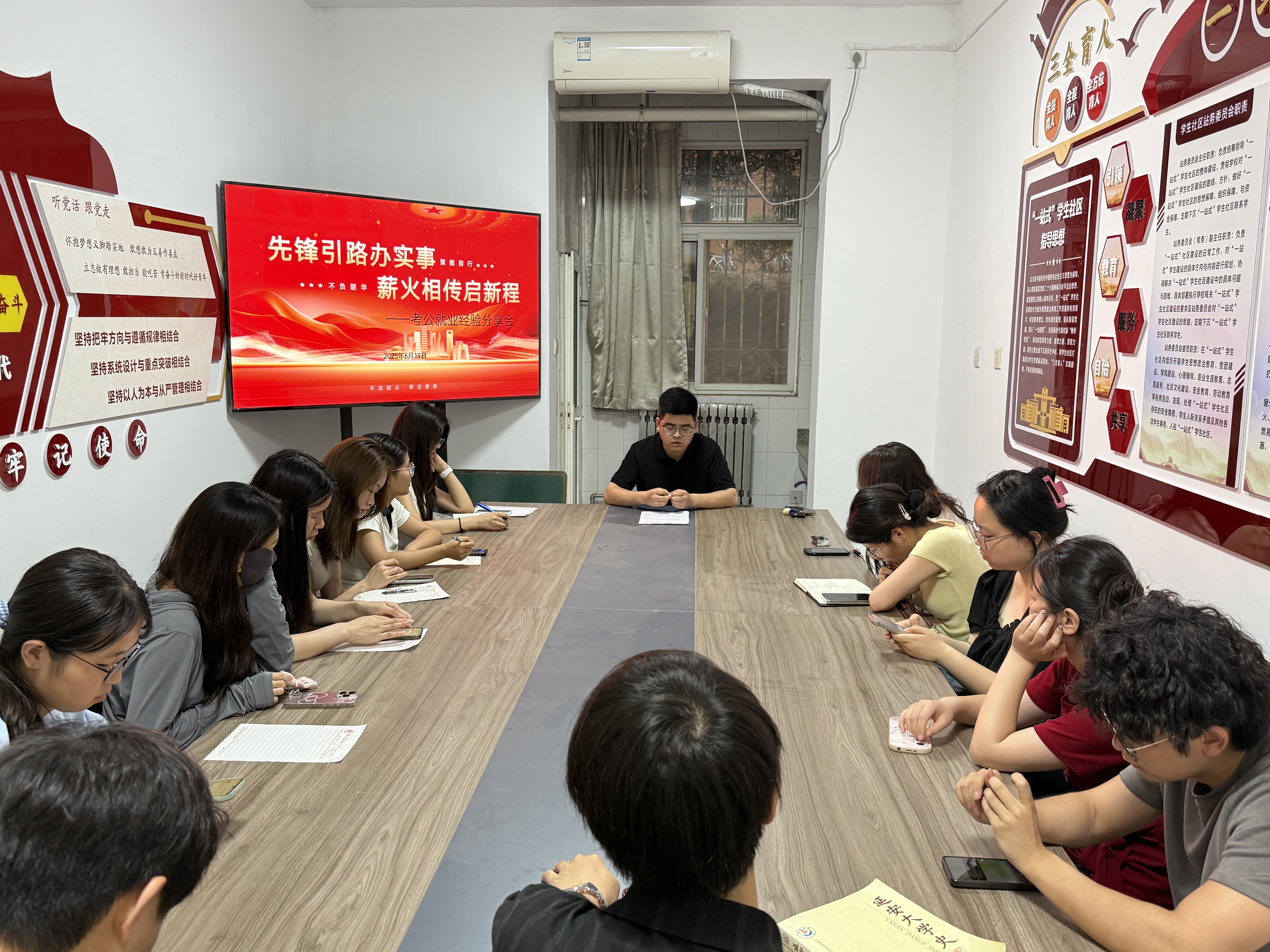 于11号公寓“一站式”学生社区开展“先锋引路办实事,薪火相传启新程”就业经验分享会。2022级研究生王振松、邢徐迎应邀分享经验,部分2023、2024级研究生参加。