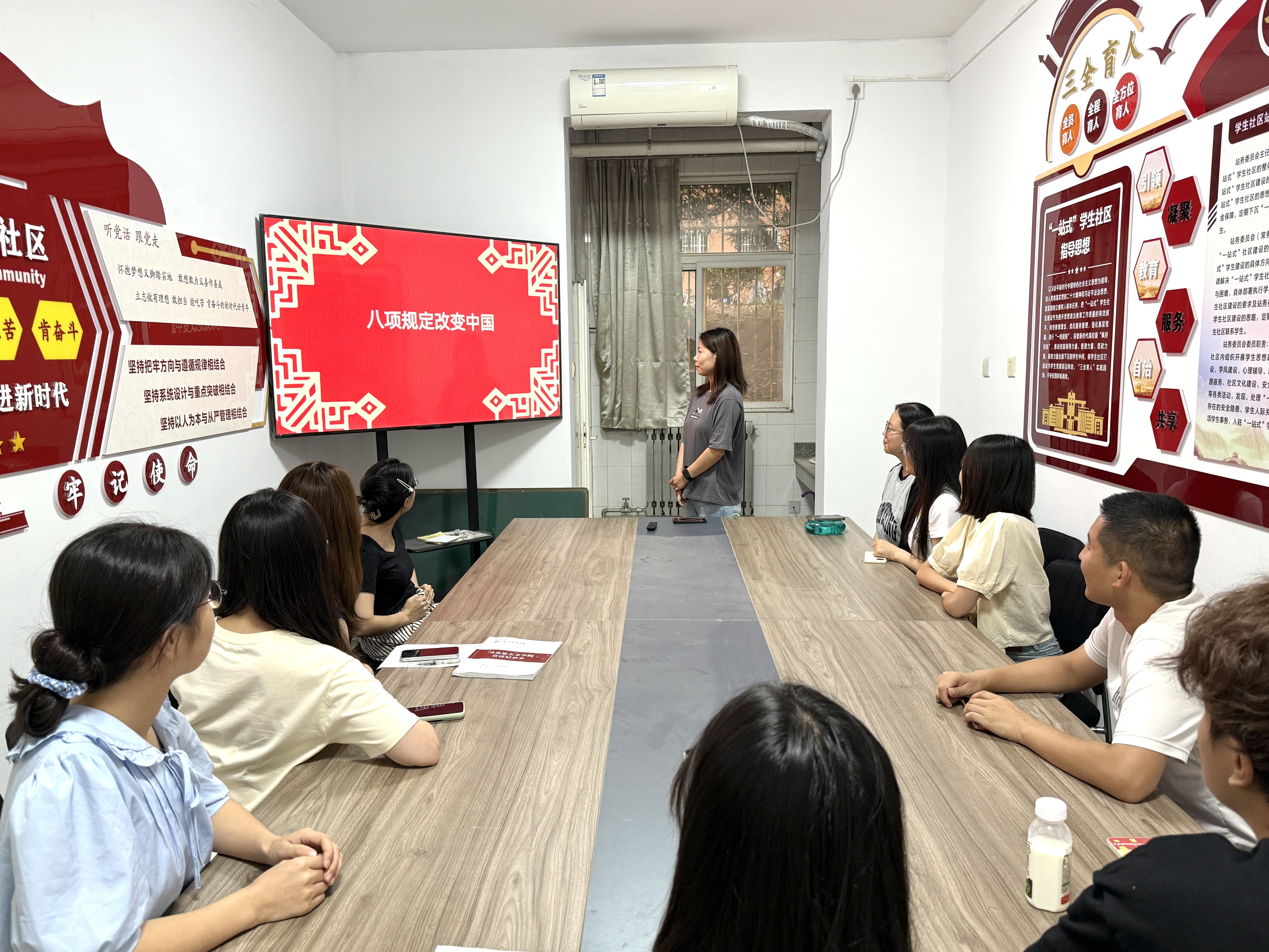 为推动深入贯彻中央八项规定精神学习教育走深走实,强化党员纪律意识,深化作风建设,6月25日晚,69书吧 学生党支部于11号公寓“一站式”学生社区开展“悟八规初心 践作风使命”主题党日活动。