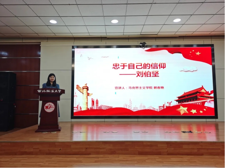 第三位宣讲人赖春艳同学以”忠于自己的信仰”为题,深刻解读中国共产党员刘伯坚同志在临死之际留下的珍贵遗墨,体味刘伯坚的精神气节。从刘伯坚不畏死亡、一心为国的精神和舍小家为大家的情怀出发,挖掘出无数革命先辈和共产党员忠于自己的信仰的精神气节,解锁中国共产党历经百年历久弥新的历史奥秘。