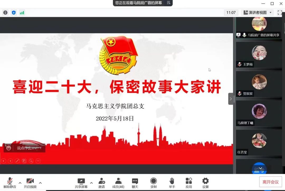 团总支集中开展了“喜迎二十大 · 保密故事大家讲”的线上主题团日活动。本次线上活动由2021级团支部书记胡广蓉主持。
