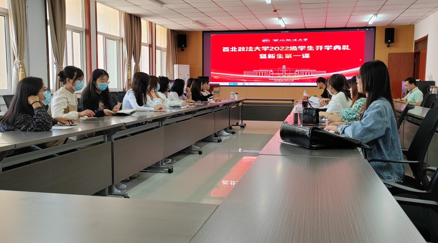 组织新生于学院会议室线下集体参加开学典礼。2022级全体新生以及学生党支部书记徐鹏、辅导员刘栩源参加活动。