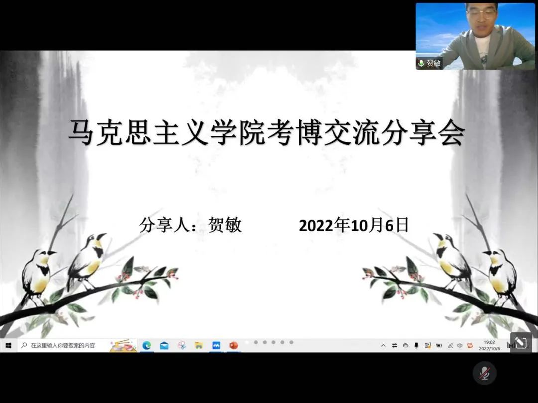 举办了线上考博经验交流分享会。本次分享会特邀上海大学2022级马克思主义理论专业博士研究生贺敏同学,为大家分享自身考博经验,解答同学们的考博疑惑。学院辅导员刘栩源、学院在读研究生及部分已毕业研究生等参与此次分享交流会,会议由学生党支部书记徐鹏主持。