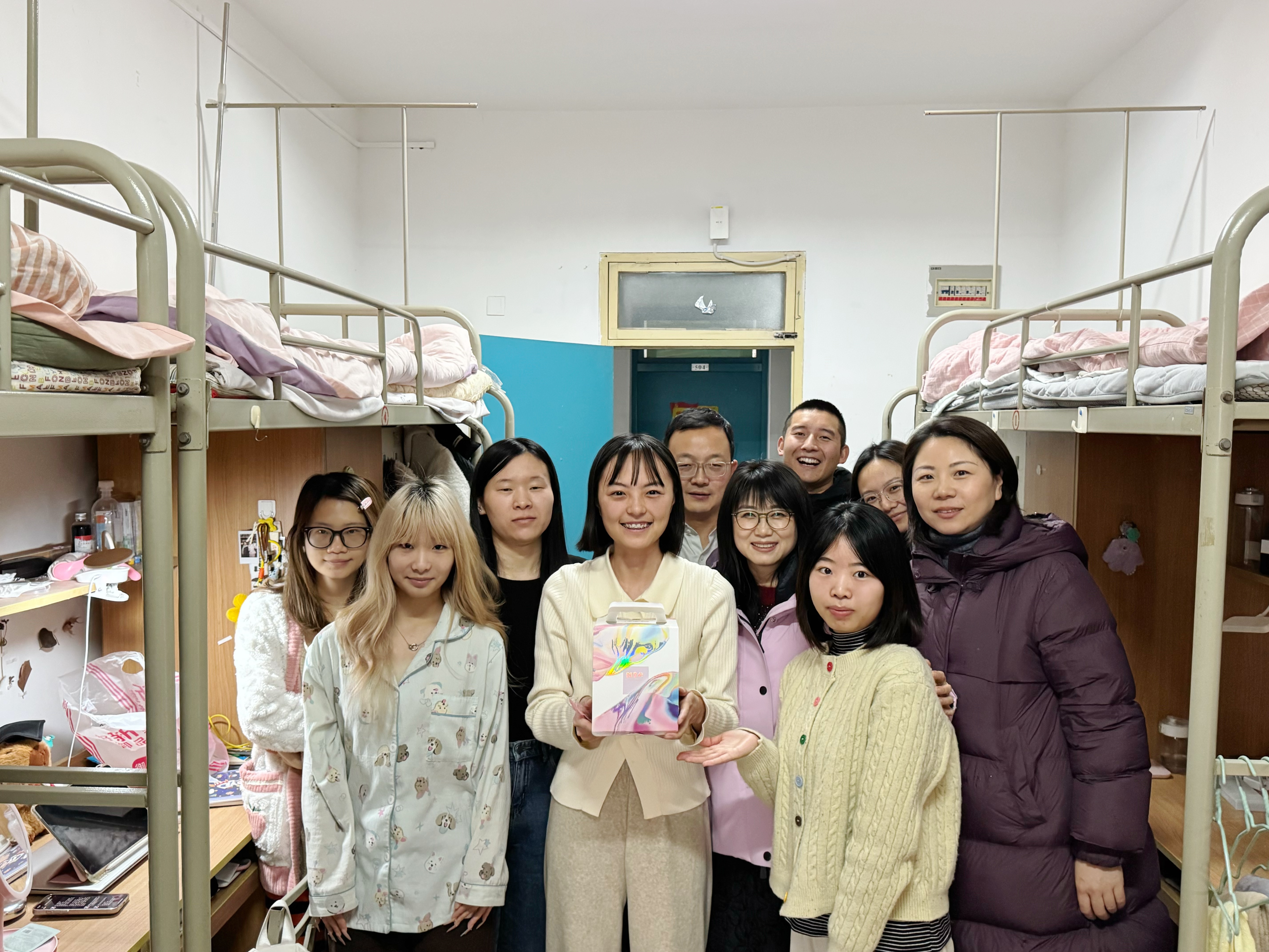 走访过程中,学院领导们向同学们致以新年祝福,送上新年礼物,并与大家亲切交谈,详细了解同学们的学习科研进展和日常生活情况,认真倾听大家在课程学习、科研安排及生活保障等方面的意见建议。其间,恰逢两位同学生日,老师们为其送上了生日蛋糕和真挚祝福,在新年将至之际为同学们增添了一份温暖与惊喜,宿舍内洋溢着温馨而愉快的节日氛围。