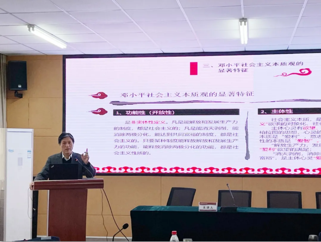 示范展示环节,刘进田教授以《邓小平的社会主义本质观》为题,通过对邓小平社会主义本质观的思想来源、基本涵义、显著特征、重大意义四个方面进行讲授,充分发掘了邓小平社会主义本质观中的价值哲学思想。