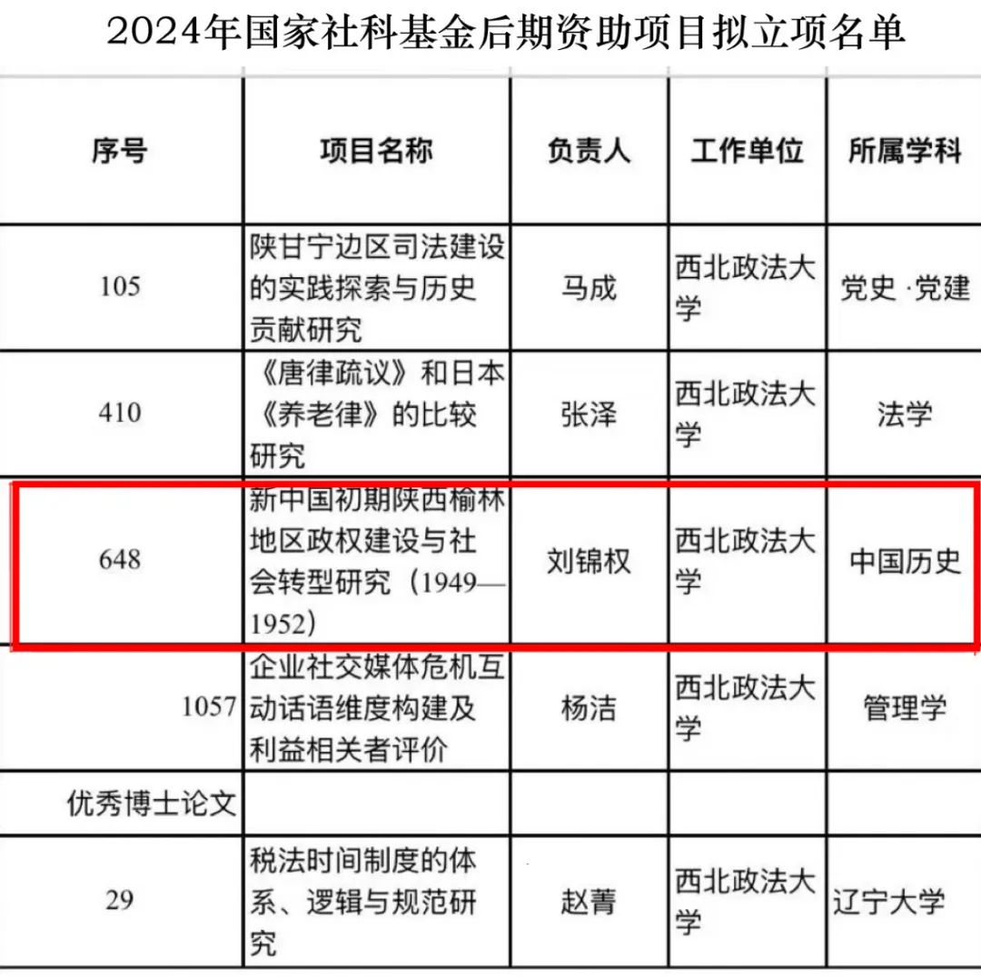 12月17日,全国哲学社会科学工作办公室将2024年国家社会科学基金后期资助暨优秀博士学位论文出版、优秀学术著作再版项目立项名单予以公示,69书吧 教师刘锦权《新中国初期陕西榆林地区政权建设与社会转型研究(1949—1952)》获批立项,喜获国家社科后期资助,为我校人文社科的持续发展注入蓬勃新机。 国家社科基金后期资助项目、优秀博士学位论文出版项目和优秀学术著作再版项目旨在鼓励广大哲学社会科学工作者弘扬优良学风,潜心治学,扎实研究,努力推出和打造具有学术创新价值和传承意义的精品力作,培养一批优秀青年学者,充分发挥国家社科基金在繁荣发展哲学社会科学中的示范引导作用。