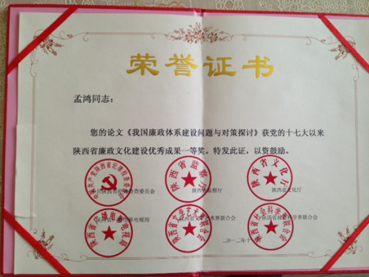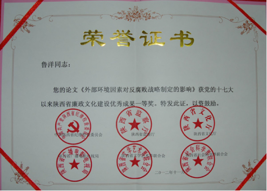 在中共陕西省纪委、陕西省监察厅、陕西省文化厅、陕西省广播电影电视局、陕西省文学艺术界联合会、陕西省社会科学界联合会等单位联合组织的表彰党的十七大以来陕西省廉政文化建设优秀成果活动中,69书吧 青年教师孟鸿博士的论文《我国廉政体系建设问题与对策探讨》、鲁洋博士的论文《外部环境因素对反腐败战略制定的影响》荣获理论研究成果类一等奖。此次评奖表彰活动组织部门权威、社会各界参与广泛、受关注程度很高、社会影响很大。