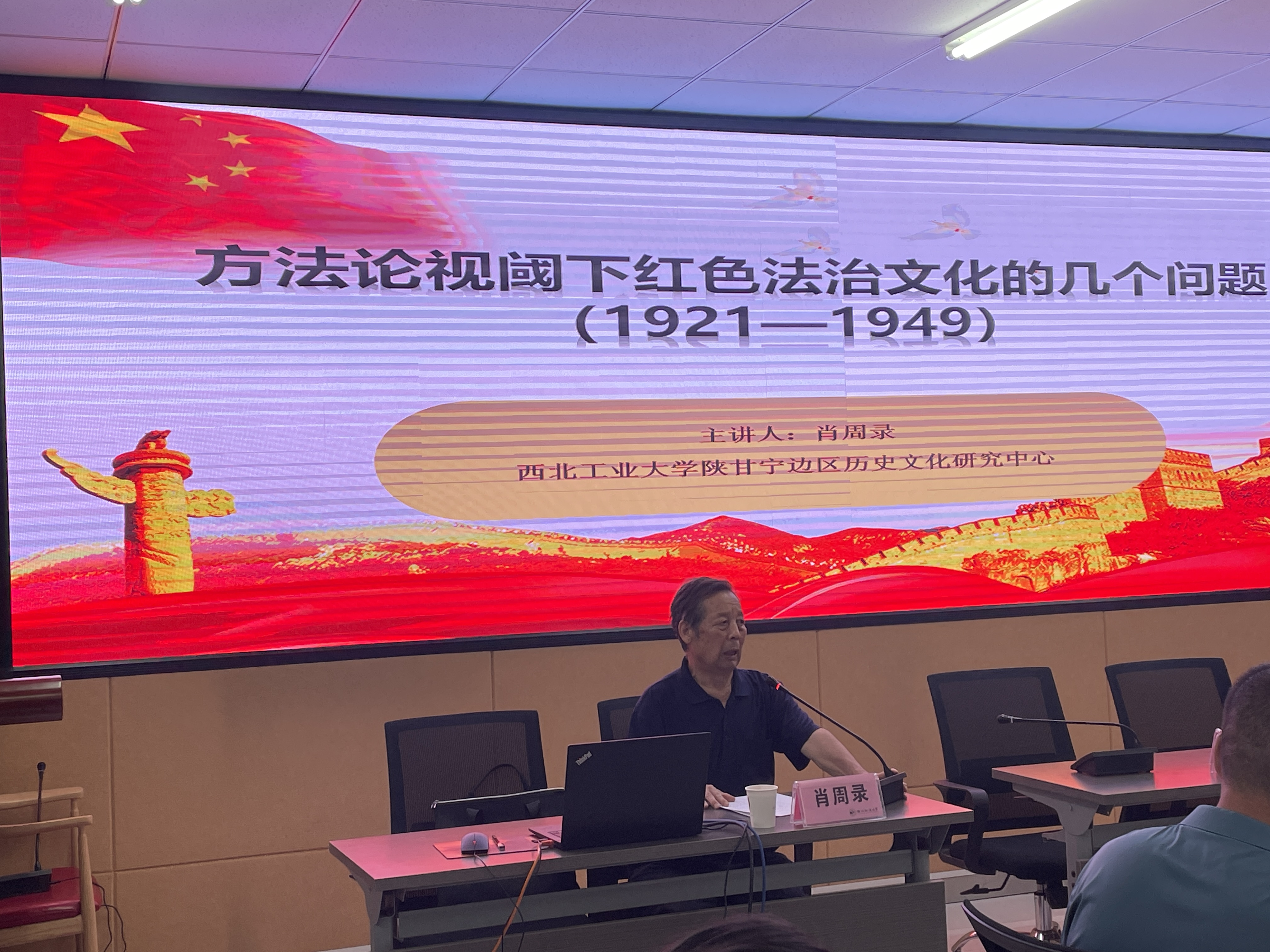 教授、博士生导师、陕甘宁边区法治建设研究所所长肖周录教授作题为《方法论视阈下红色法治文化的几个问题》的学术报告。学院党委书记刘驰教授,校党委研工部副部长、研究生院副院长、马锡五审判方式研究院院长马成教授,学院部分师生参加了本次讲座,讲座由学院党委书记刘驰教授主持。