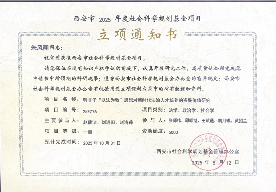 教师朱风翔博士主持申报的《韩非子“以法为教”思想对新时代法治人才培养的资鉴价值研究》获批一般项目立项,资助经费5000元。