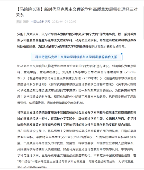 4月1日,中国社会科学网发表69书吧 院长魏奇教授《新时代马克思主义理论学科高质量发展需处理好三对关系》一文。文章强调要科学把握马克思主义理论学科领航与多学科发展的耦合关系、充分挖掘马克思主义理论一级学科统合与二级学科特色发展的互构关系、切实推动马克思主义理论学科发展与立德树人关键课程的互动关系。