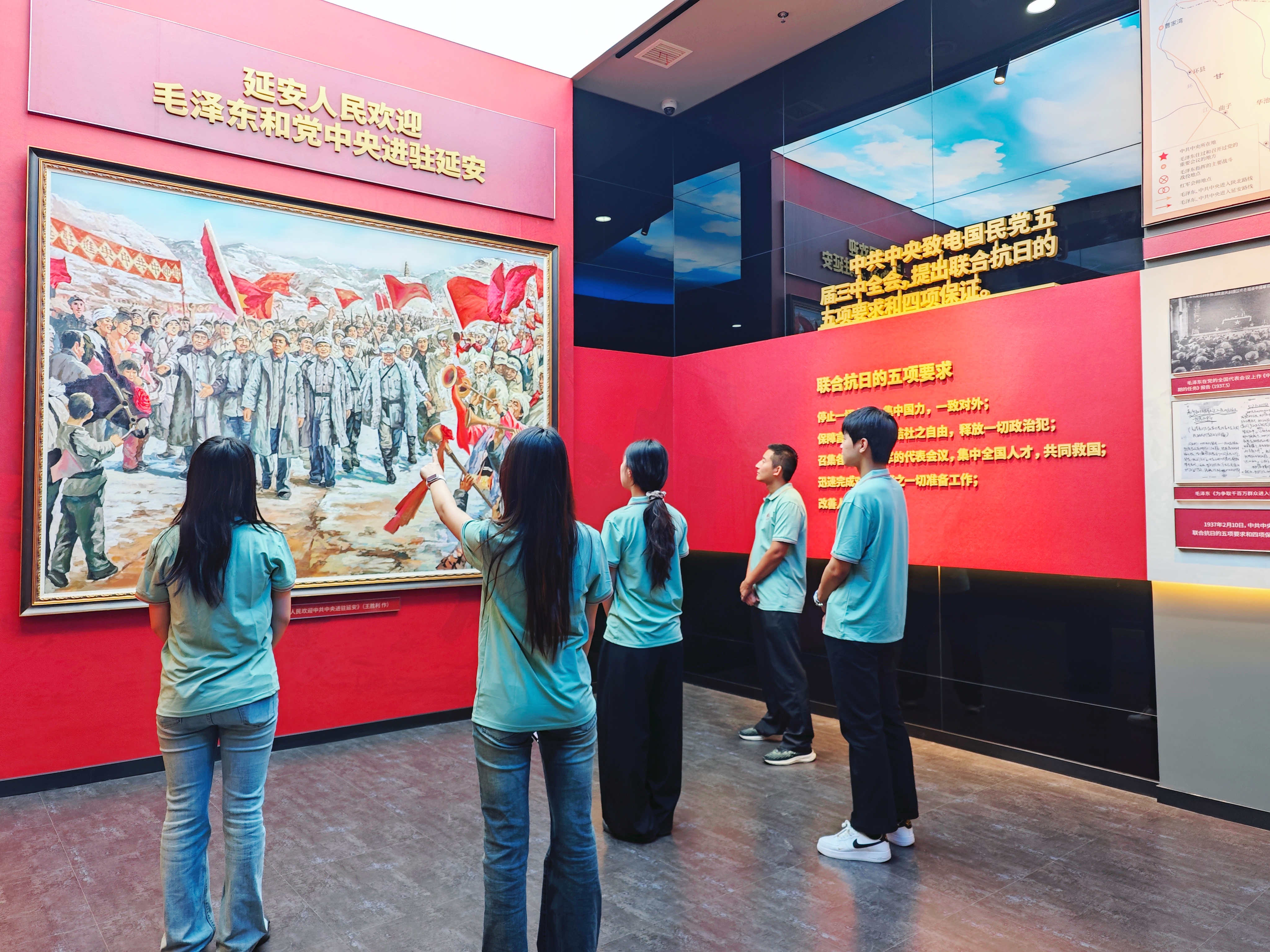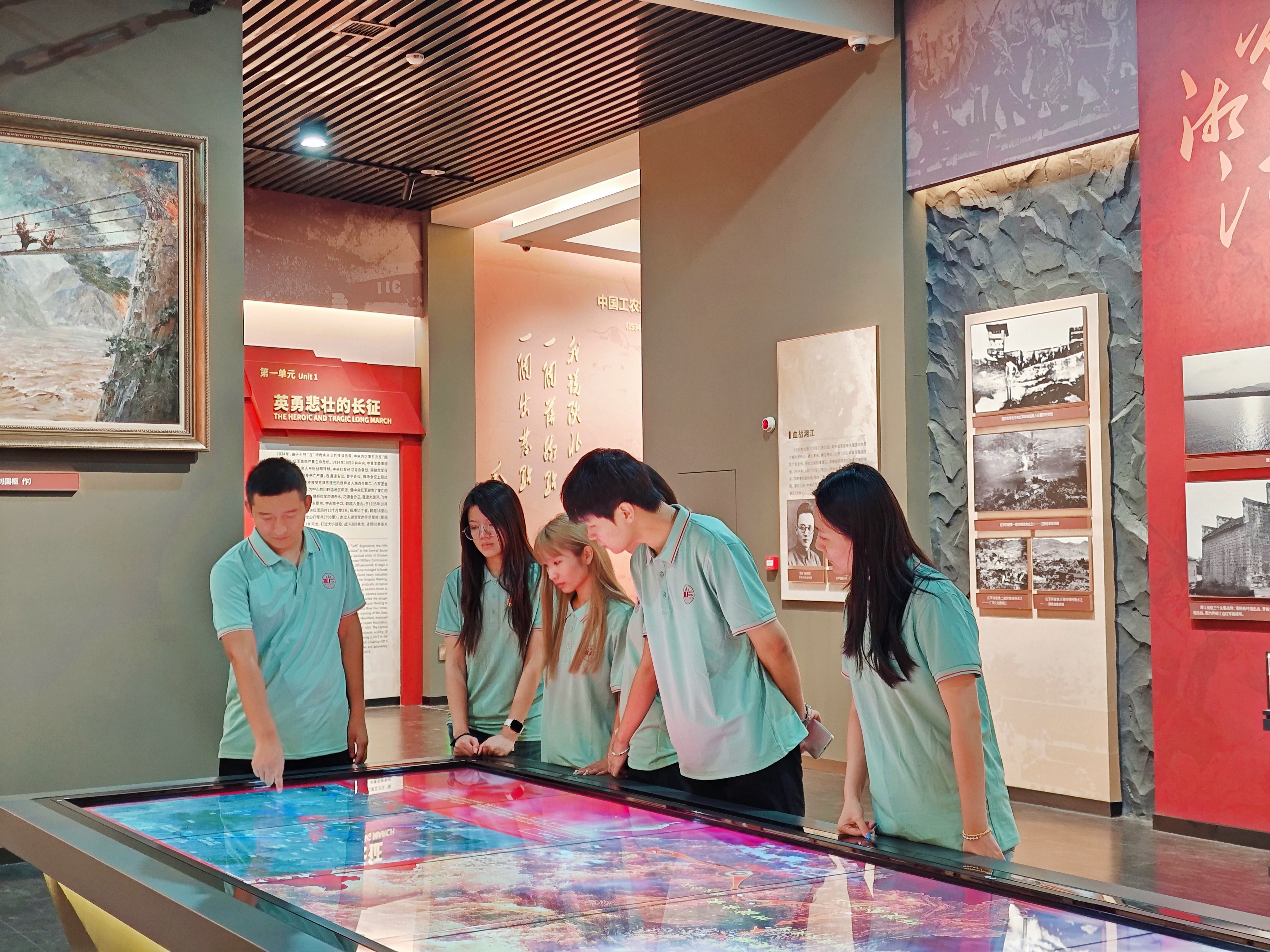 纪念园内松柏苍翠,长征主题雕塑巍然矗立,生动再现了红军将士艰苦卓绝的革命历程。在讲解员的引导下,实践团成员依次参观了“战略转移”“浴血奋战”“胜利会师”等主题展区。通过一批珍贵的历史手稿、实物武器和影像资料,团队成员们深入了解了长征途中红军面临的重重困难与坚定信念,从湘江战役的鏖战到遵义会议的转折,从雪山草地的艰险跋涉到三大主力会师的欢欣鼓舞,一段段历史片段令大家沉浸其中,不时低声交流体会。