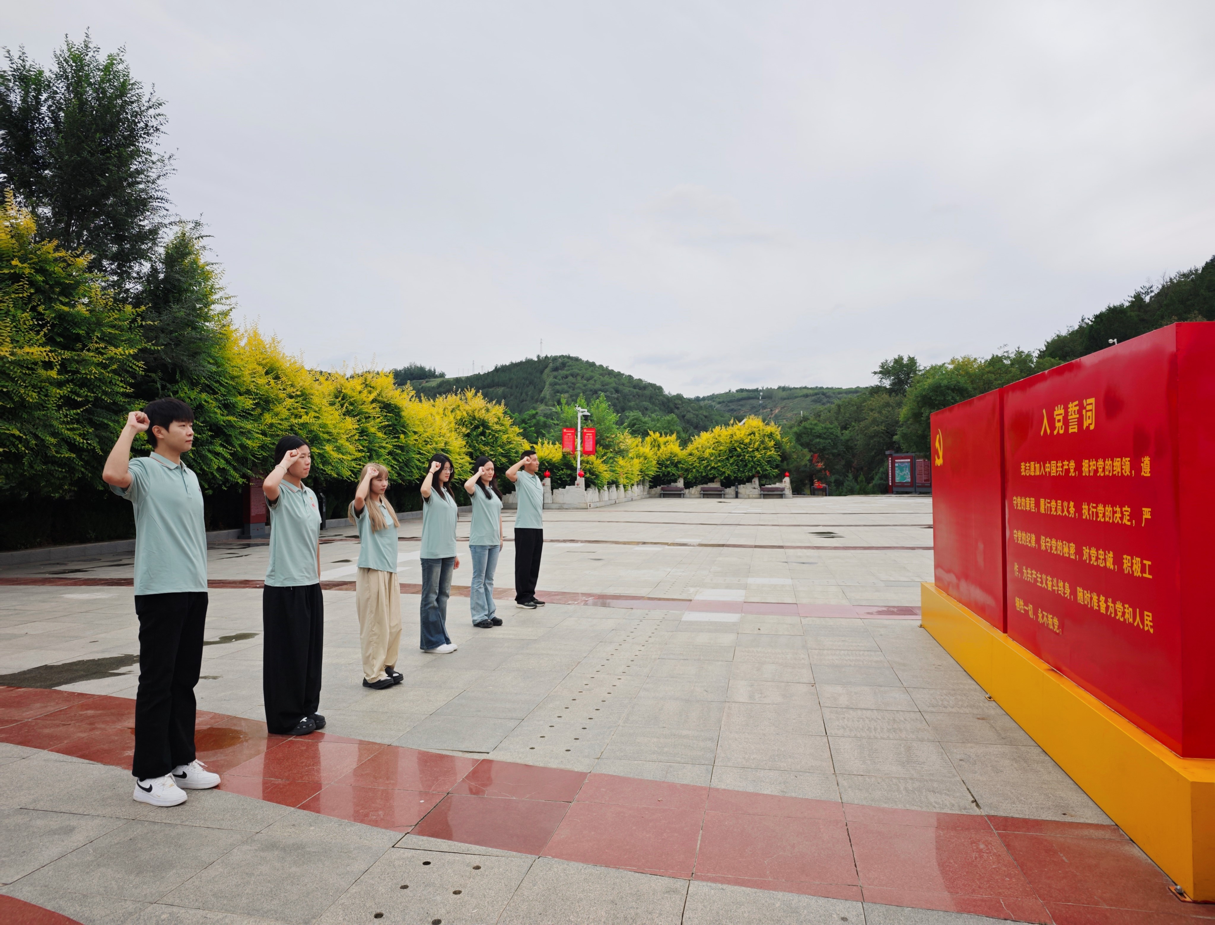 参观结束后,实践团全体成员在纪念碑前整齐列队,举行重温入党誓词仪式。面对鲜红党旗,队员们高举右拳,庄严宣誓:“我志愿加入中国共产党……”誓言铿锵,响彻云霄,既是对革命先烈的深切缅怀,也是对初心使命的郑重承诺。